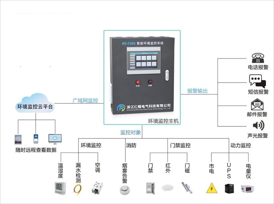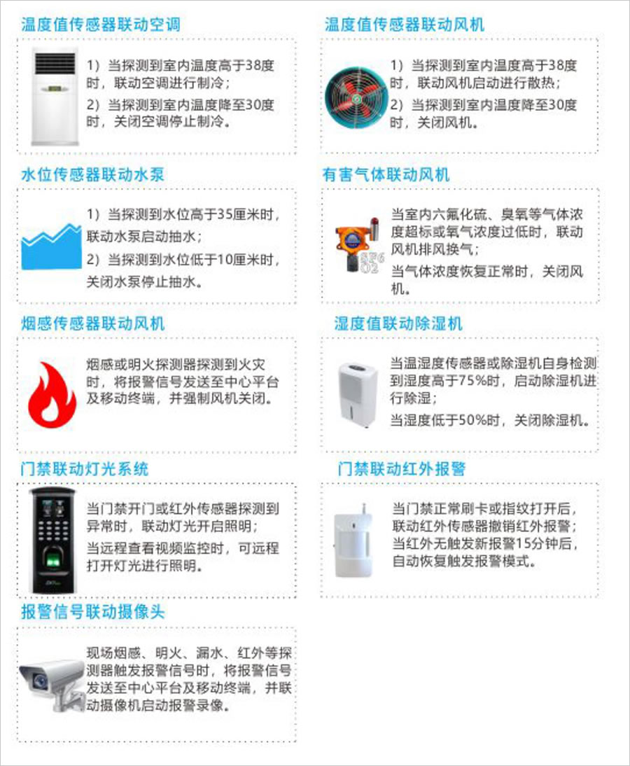 ■配電室環境監控係統可采集配電室的各項環境參數,包括電纜夾層水位、溫濕度、配電(diàn)室溫濕度、煙感信息,並可對水泵、風機進行啟停控製,及時處理險情。